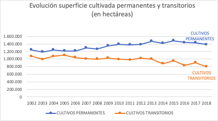 Evidencia de lo dicho es que del año 2000 para acá en el Ecuador decreció la superficie en cultivos transitorios, donde está la mayor parte de los alimentos para el consumo nacional, se perdieron doscientas mil hectáreas. Mientras que, en permanentes, donde están la mayor parte de cultivos para la exportación, se incrementó en ciento cincuenta mil hectáreas. Veamos el siguiente gráfico, elaborado[3] sobre los datos de la ESPAC nacional[4].