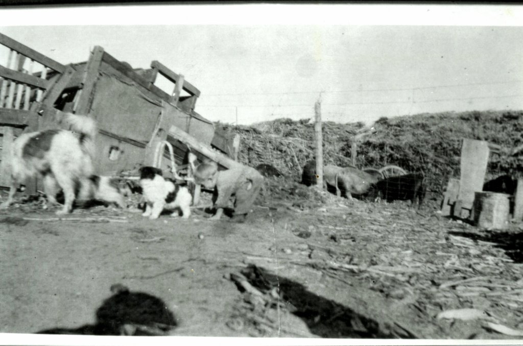 Figura 1. Meu pai (centro) brincando com os cachorros no sítio que meu avô trabalhou como meeiro em Otis, Colorado, por volta de 1922.